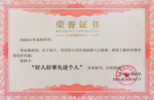 2026年2月,材料工程学院学生杜泓财收到走失老人家属专程送来的锦旗,以此致谢他暖心救助高龄走失老人的善举。